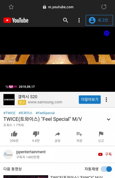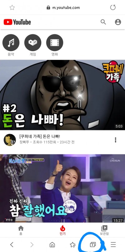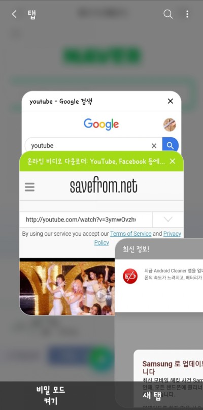 아래의 탭을 누르면 지금 열어놓은 탭이 보이실 텐데 맨 밑에 있는 탭(광고)을 스와이프로 눌러주시고 두 번째 재구이를 부탁드리겠습니다 물론 위의 트와이스 뮤직비디오는 보시다시피 잘 다운로드가 돼서 다시 두 번째 탭으로 들어갈 필요는 없으니까