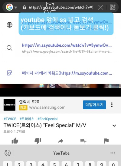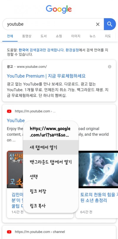 그 링크에 대한 옵션이 나오는데 새로운 탭에서 열기를 이용하여 들어가세요. 그러면 위의 사진과 같이 숫자 2로 새로운 탭으로 열려있는 것을 볼 수 있습니다. 유튜브에서 돋보기를 누르고 원하는 영상을 아무거나 검색해서 위와 같이 들어가면 위에 뜨는 주소 입력창을 눌러주세요 한 번 누르면 전체가 드래그가 되어 있는데 앞으로 당겨서 youtube를 찾아주세요. youtube 앞에 ss만 붙이고 검색 버튼을 누르면 다운할 수 있는 새로운 사이트가 나타납니다.정말 잘만든 사이트같네요 유튜브 영상에 SS만 붙이면 다운링크에서 떨어진다니 ㅎㅎ 이런 멋진 생각을 가진 제작자 칭찬해.