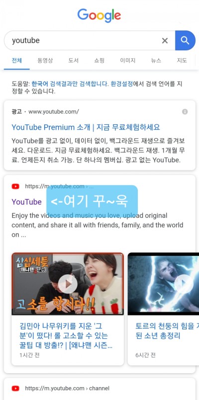 네이버나 구글에 유튜버를 검색하시면 위와 같이 유투브 링크가 나옵니다. 이링크를그대로누르면자동으로설치되어있는어플에접속되므로