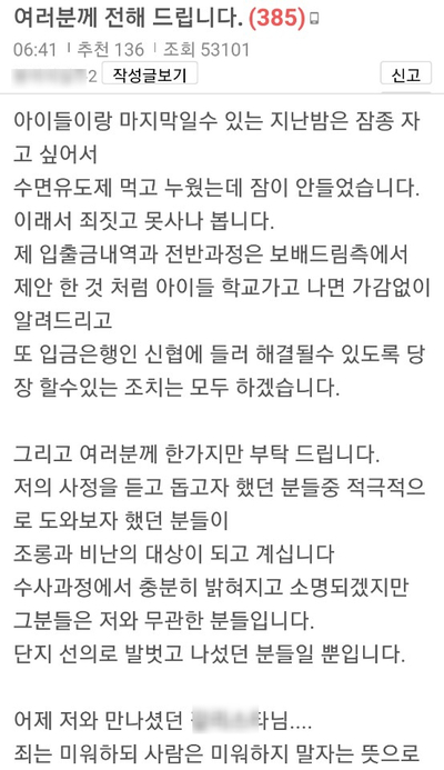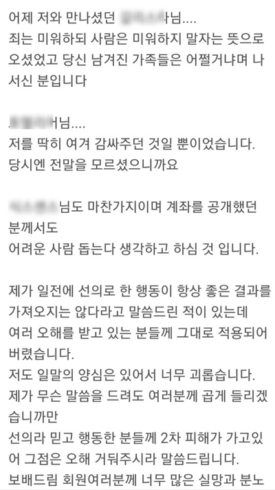보배드림 운영자는 현행법에서는 1,000만원 이상의 기부금품을 모집하기 위해서는 사용계획서를 작성해 광역자치단체에 등록해야 한다고 규정하고 있다며 쓰레기택배를 보내고 집을 방문해 가족을 비웃었다는 계정의 접속IP와 피해를 입었다는 아이디가 일치된 기록을 확인한 피해액이 크기 때문에 더 이상 피해자가 발생하지 않도록 당부드립니다.