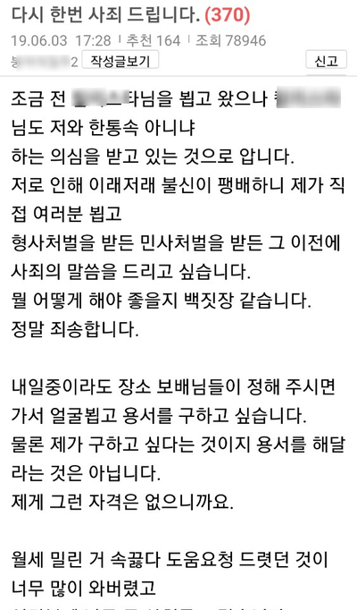 운영자까지 나서 oo의 질주는 앞서 자신이 쓴 글을 모두 삭제하고 해명문을 올렸다.그는 올린 글 상황은 모두 사실이고 퇴거 통보일이 5월 30일인데도 막막해 이리저리 수소문한 끝에 쓰레기 택배 글을 각색해 올렸다고 해명했다.