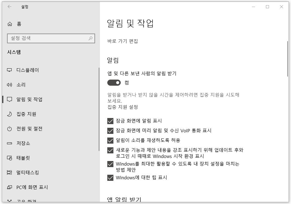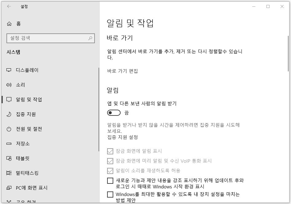 설정 > 시스템 순서대로 클릭 후 알림 및 작업을 클릭하시면 여기에도 알림 관련 설정이 있습니다. 모든 알림을 꺼주세요. 체크를 해제해 주세요. 그럼 왼쪽 상단의 홈 아이콘을 다시 클릭하세요.