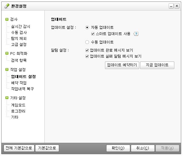 이번에는 작업설정에 있는 업데이트 설정을 클릭해 주세요. 여기 보시면 알림 설정이 되어 있습니다. 업데이트 완료 메시지 보기와 업데이트 실패 알림 메시지 보기가 있는데 둘 다 체크를 해제해야 합니다.