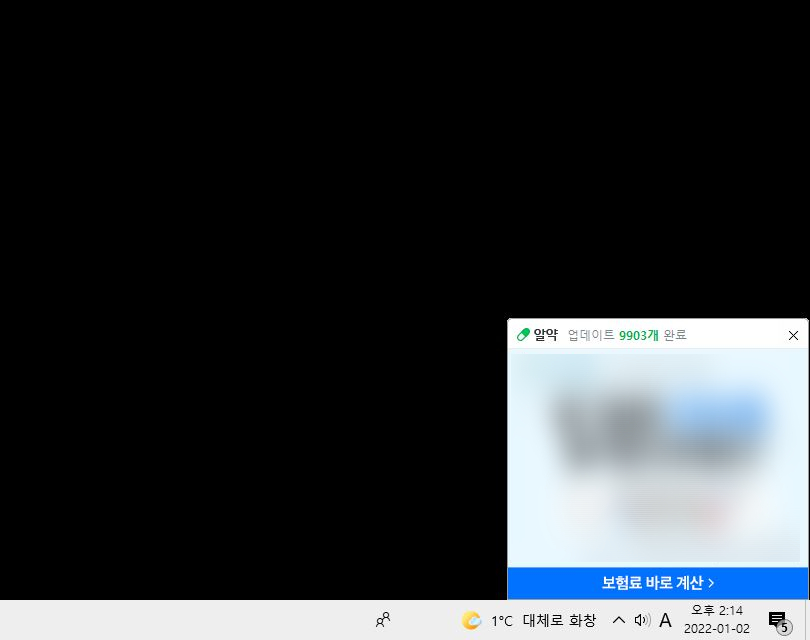 포스팅을 하려고 하는데 마침 알약에서 온 광고가 뜨네요. 바로 이런 식이죠. 제목을 보시면 알약 업데이트 완료를 알리는 창처럼 보일 수 있지만, 그렇지 않고 글자 그대로 광고 배너입니다.
