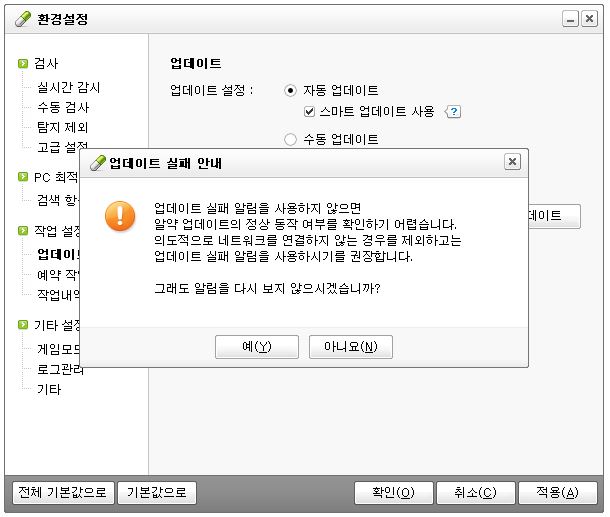 업데이트 실패 알림 메시지에 대한 표시 체크를 해제하면 이렇게 알림창이 뜨는데 무시하고 예 버튼을 누르십시오.