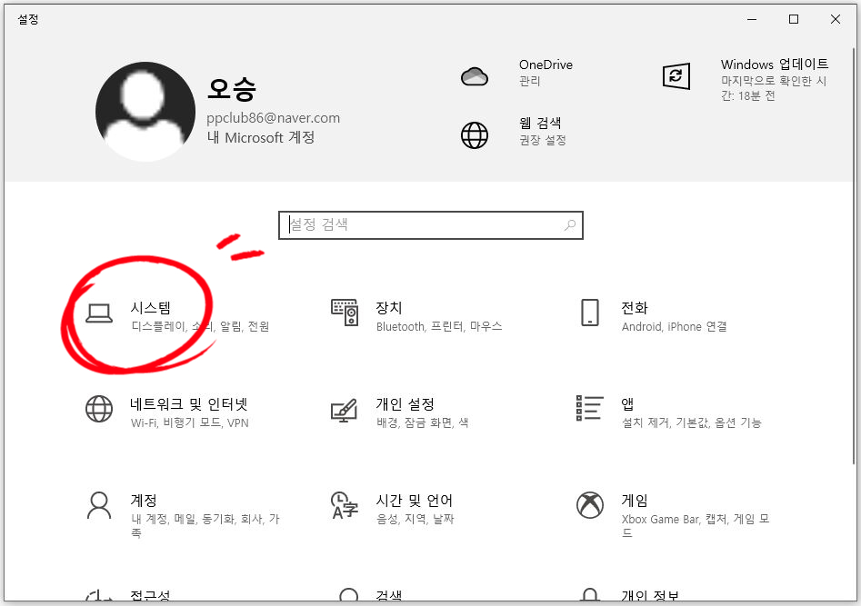 설정창이 뜨면 시스템을 찾아 클릭하십시오.