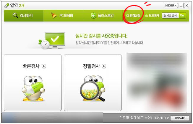 먼저 컴퓨터에 인스톨 되어 있는 알약을 실행하세요. 알약으로 전송되는 광고창이 뜨는 경우, 현재 실행되고 있지 않더라도 컴퓨터에 설치된 것을 알약 아이콘처럼 실행하세요. 여기서 환경설정을 클릭하십시오.