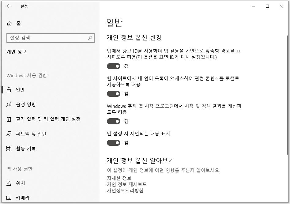 설정 > 개인정보 > 일반 탭을 누르시면 여기에도 이렇게 광고와 관련된 알림 설정이 있습니다. 여기에 붙어있는 것을 전부 풀로 변경해 주세요. 이것만으로도 윈도우10의 오른쪽 아래에 나오는 대부분의 광고들이 차단될 거라고 확신해요. 만약악성프로그램이설치되어있어서광고가나오는경우에는그프로그램을찾아서삭제하거나,차근차근찾아서삭제할수없다면프로그램을다운받아서설치하는것밖에없습니다. 오군이 알려준 방법은 어떤 외부 프로그램도 다운받아서 설치하지 않은 상태에서 귀찮은 광고를 차단할 수 있는 방법이니 우선 이렇게 해보면 좋을 것 같아요.