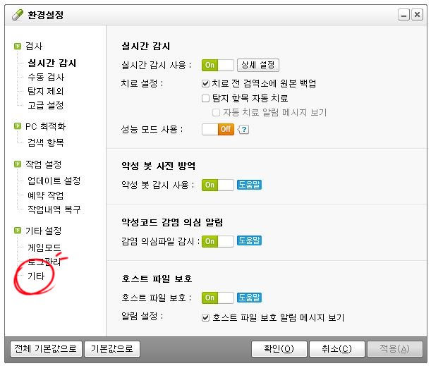 환경설정을 클릭하면 실시간 감지 탭이 열리므로 기타 설정의 '기타'를 클릭하십시오.