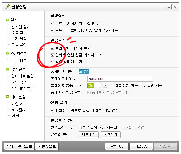 그 외를 클릭하면 통지 설정의 3가지 체크 박스가 있습니다. 보안 안내 메시지 보기, 인터넷 연결 알림 메시지 보기, 알약 알림 보기까지 3가지 알림을 모두 꺼주세요. 앞에 있는 체크박스에 있는 체크를 해제해 주세요. 다음으로 적용버튼을 눌러 변경한 내용을 저장하세요.