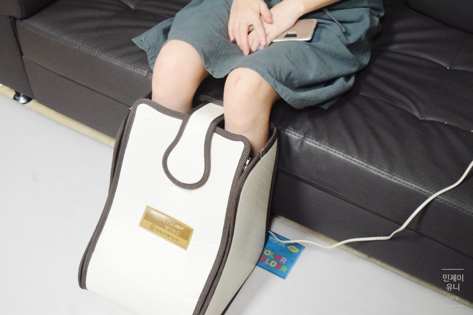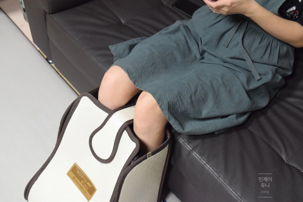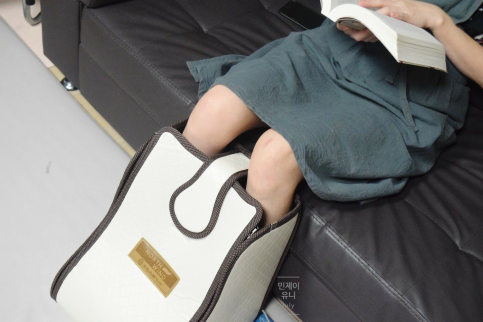 부드러운 재질이라 족욕기 작동 중 다리를 구부렸다 폈다 해도 불편하지 않기 때문에 거실 소파에 앉아서 하기도 하고 안방 침대에 와서 눕기도 합니다ㅎ