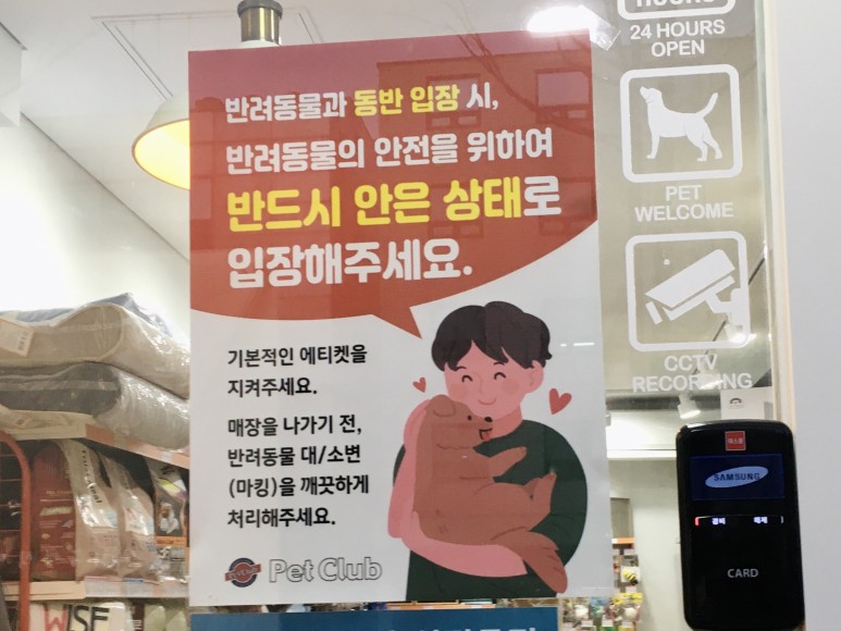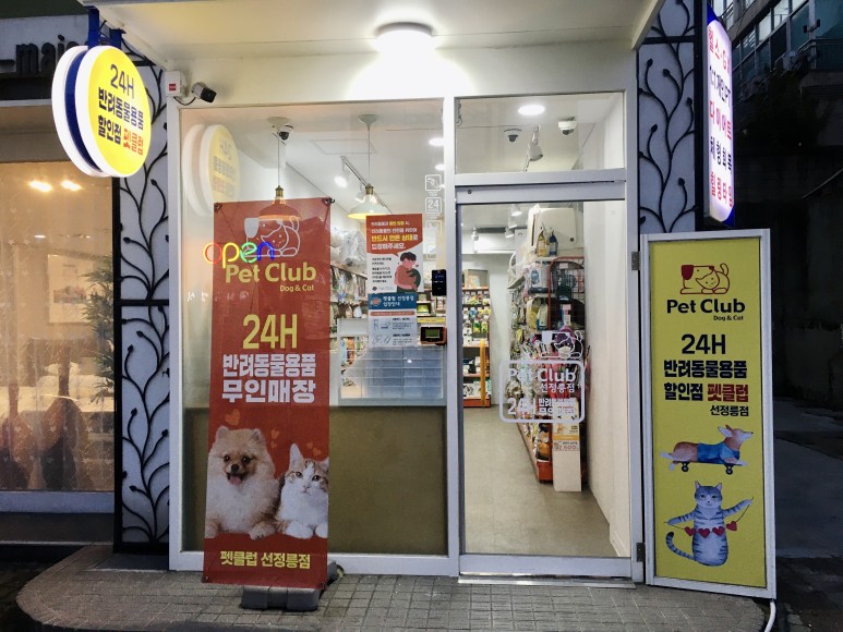 '반려동물 용품 무인매장 24시간'이라고 적혀 있다.보통 애견용품점은 폐점시간이 정해져 있어서 급하게 필요한 물건이 있을 때는 살 수 없었는데 이렇게 24시간 영업을 하다니 좋네~