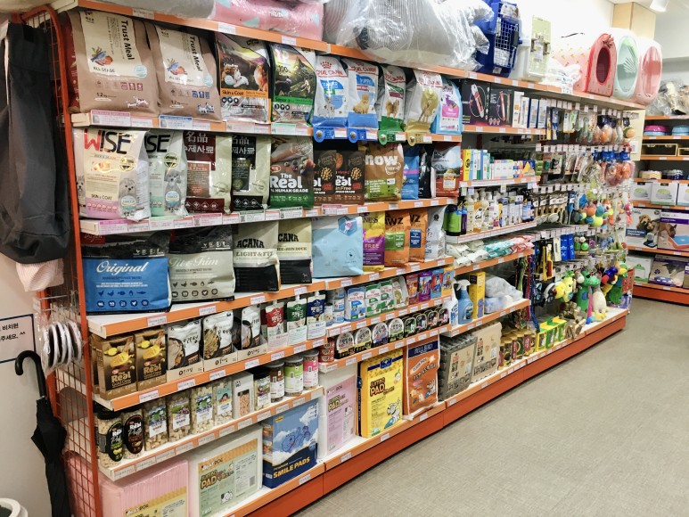 문을 열고 들어서면 사람이 없는 애견숍의 상품이 이렇게 보인다.