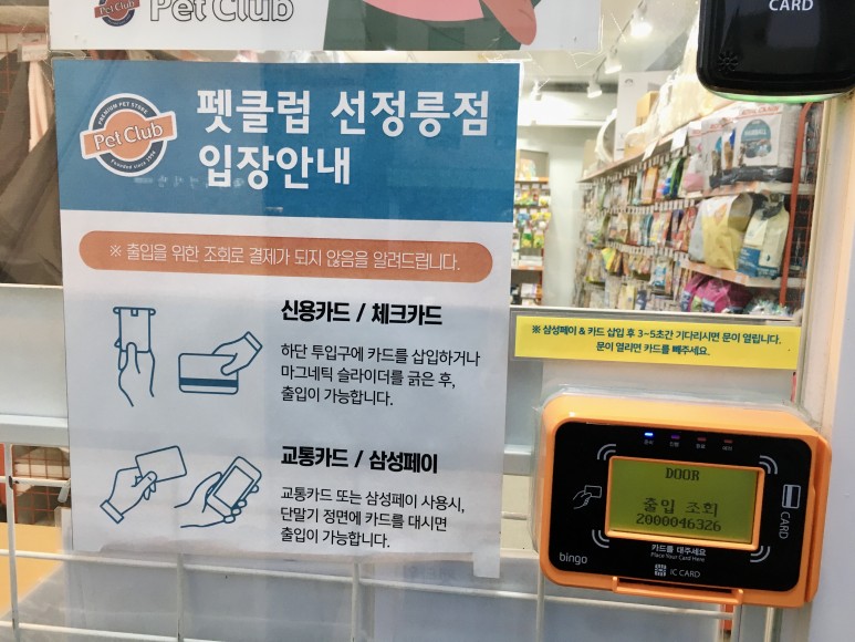 무인 애견샵은 어떻게 입장하냐면~신용카드와 체크카드는 하단 투입구에 카드를 삽입하거나 마그네틱 슬라이더를 사용하면 되고 교통카드나 삼성페이는 단말기 정면에 카드를 대면 된다.편리하네~