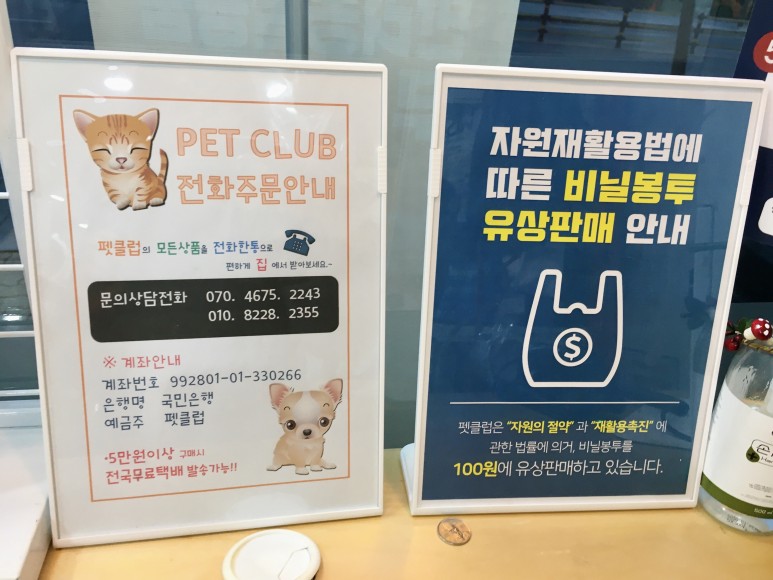집에서 전화 주문도 할 수 있다는 안내와 계좌번호가 적혀 있으며 5만원 이상 구매시 전국 무료 택배 발송이 가능하다.그리고 비닐봉투는 100원에 유상 판매하고 있다.비닐은 테이블 밑에 있다.