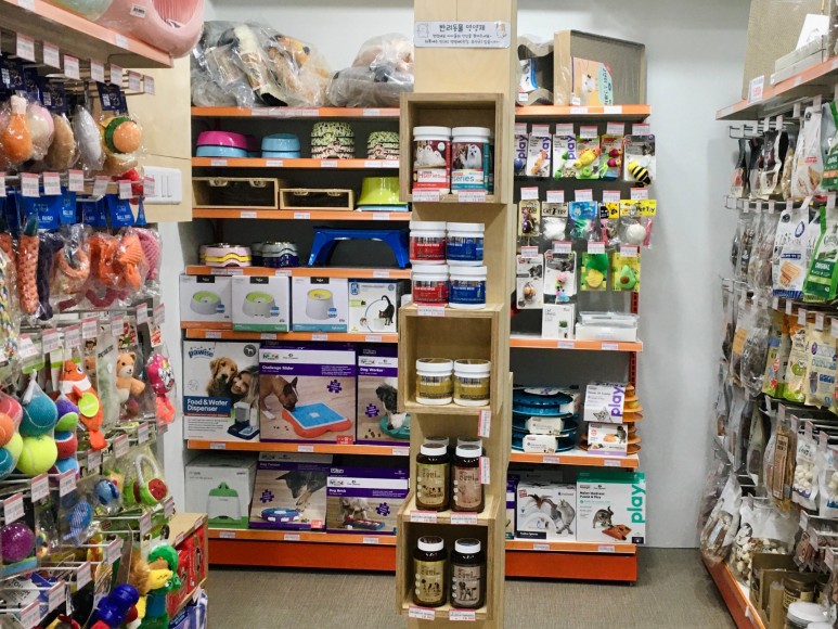 왼쪽에는 사료, 장난감, 케이지 등이 있고