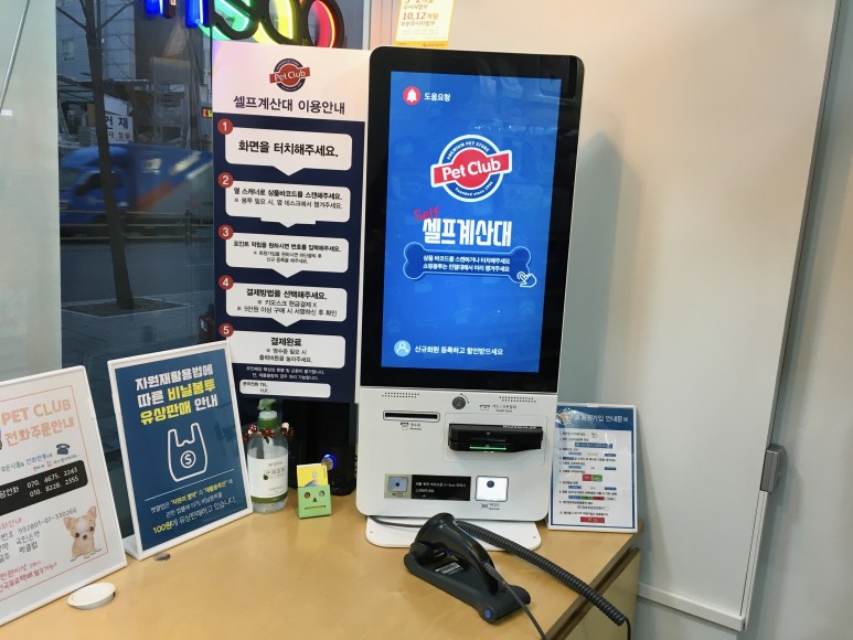 입구에는 셀프 계산대가 있고 이용 안내가 적혀 있다.