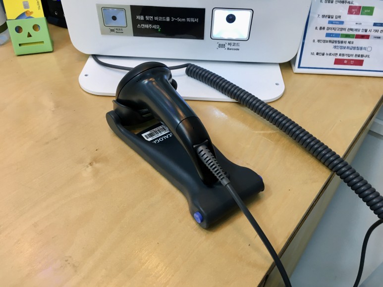 셀프 계산대 아래 오른쪽 라이트가 켜진 곳에 바코드를 대면 나온다.앞에 있는 바코드의 읽기로 읽어도 된다.