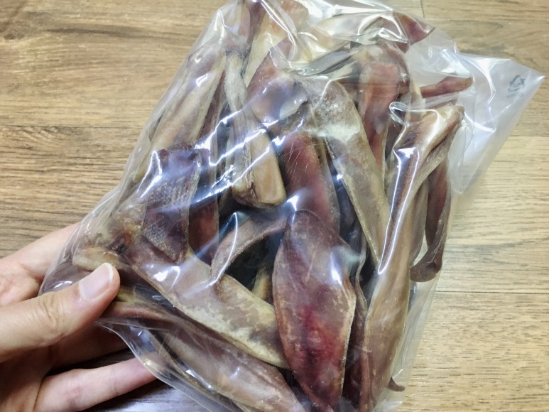 집에 가져와서 강아지랑 백이랑 2개를 줬어돼지 귀 슬라이스는 딱딱하지만 잘 먹었고~