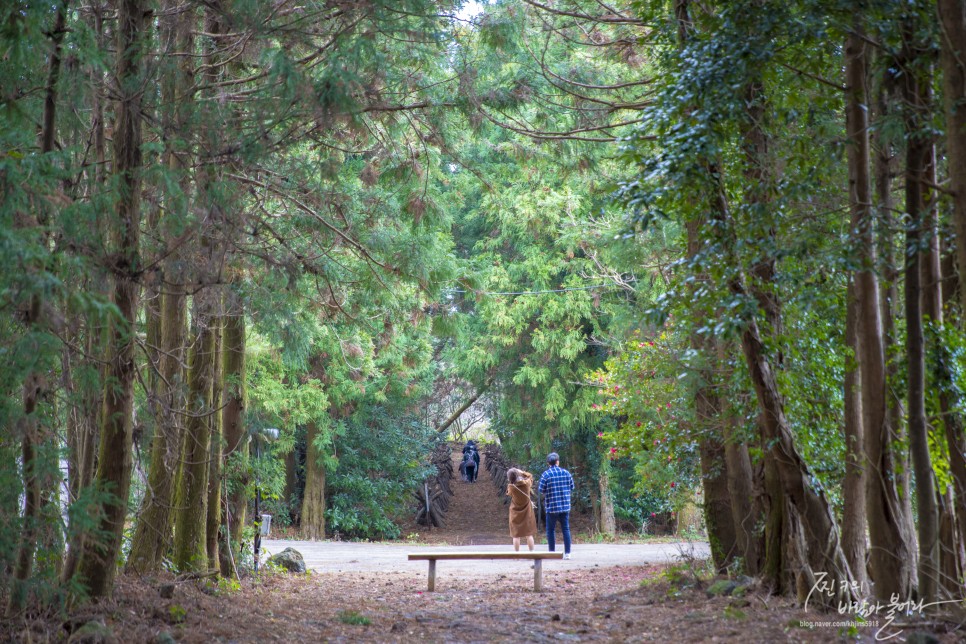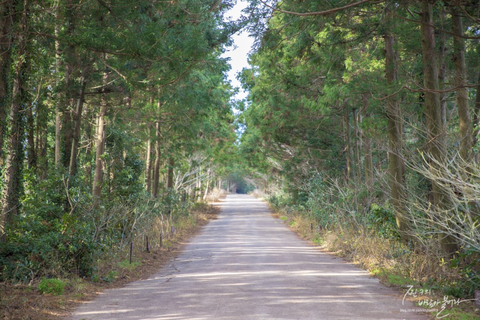 동백나무가 있는 곳 바로 옆에는 제주 삼나무 숲길이 빽빽하게 조성되어 있어 겨울에도 초록색을 볼 수 있고 예쁜 사진을 찍기에 좋았다.
