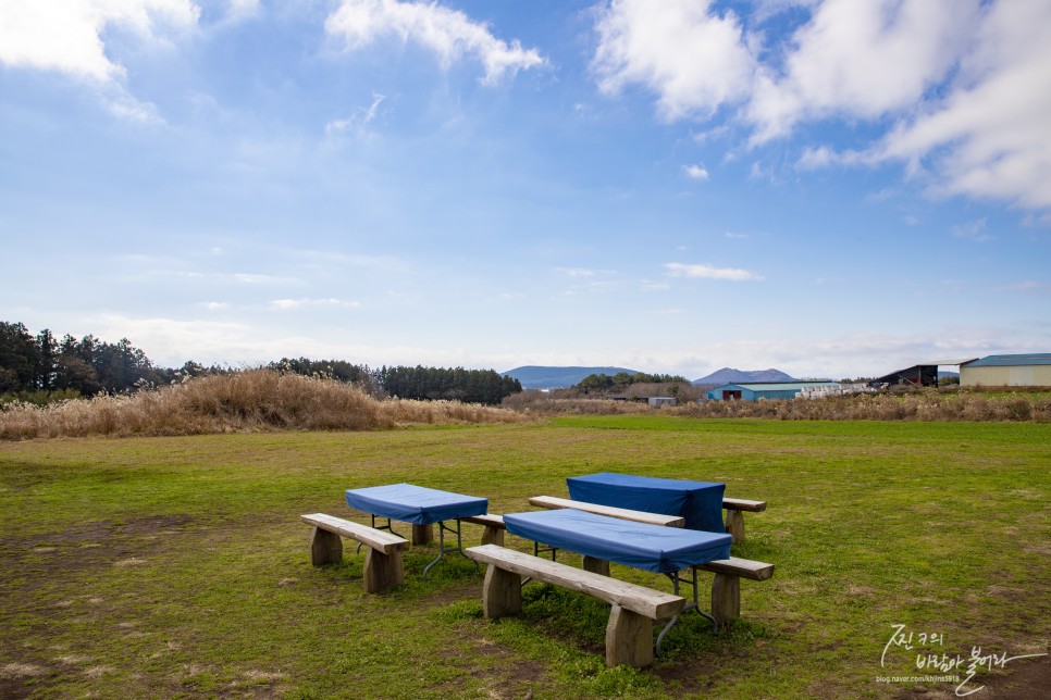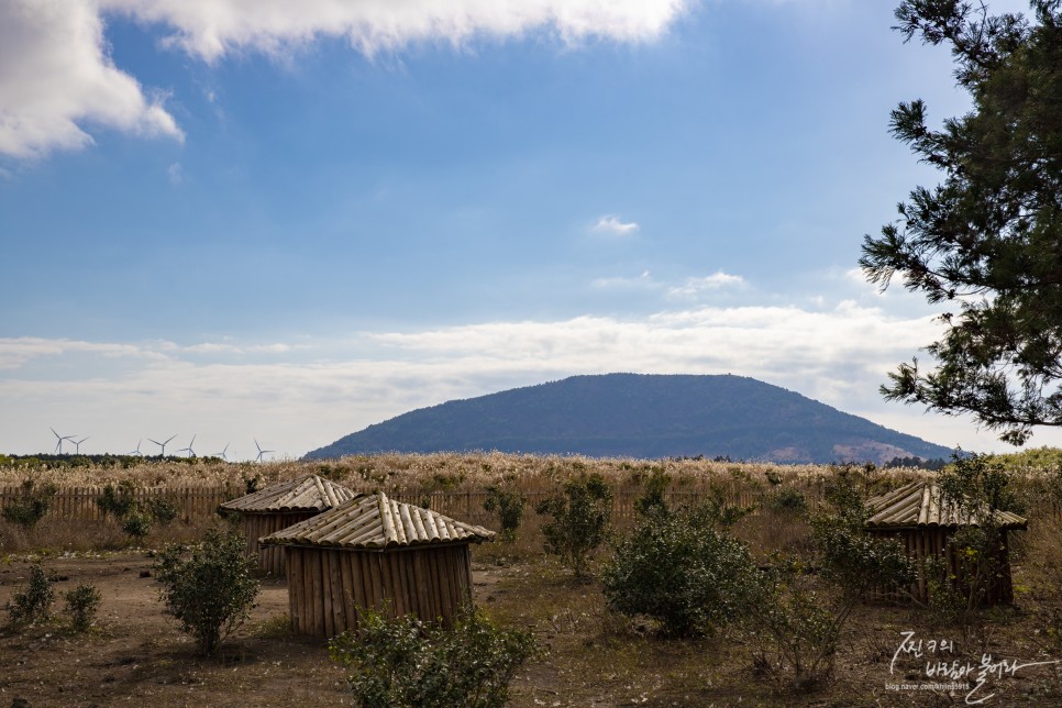 동물 농장 뒤로는 갈대가 무성하게 자라 있었고 멀리 풍력 발전기와 오름이 있는 풍경이 보였다