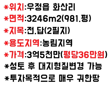 가까이 남양, 비봉 팔탄 등 이미 화성 남부권 도시에서 각종 공장과 아파트 등 호재가 예정되어 있어 투자 목적으로 자리 잡고 있습니다.