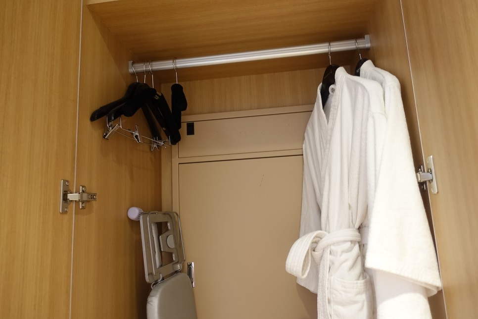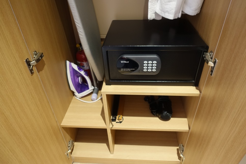 가운 금고 다리미, 헤어 드라이어 등의 용품이 있는