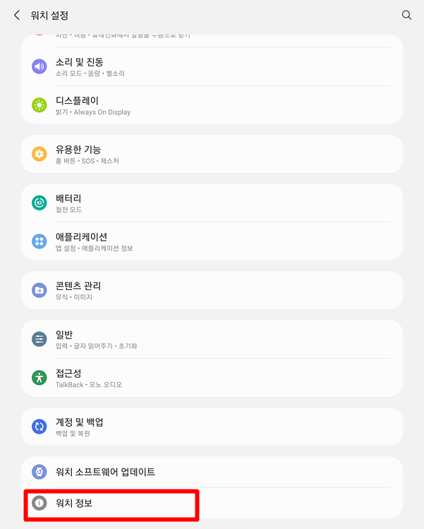 워치 화면에서 위에서 아래로 쓰다듬으면 이 화면이 나타납니다.사용자에 따라 설정 아이콘의 순서가 다를 수 있는데 화면처럼 '위치'를 미리 눌러줍시다.