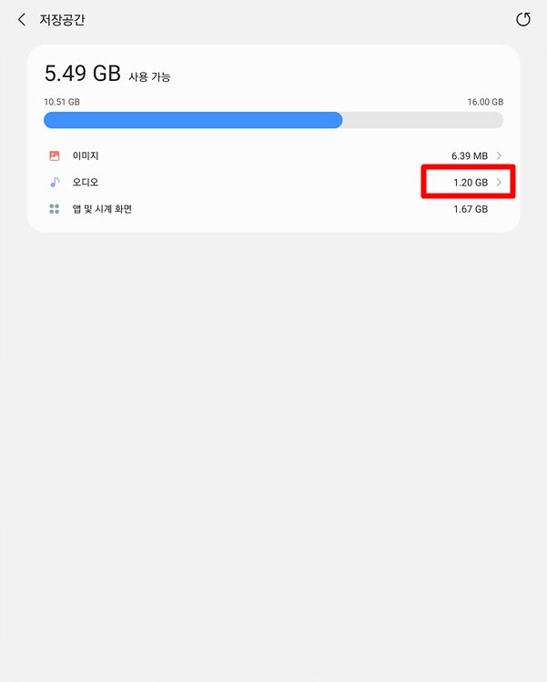 그러면 현재 내가 얼마나 사용하고 있고 어느 정도 여유가 있는지 알 수 있어요.오디오 부분의 빨간 표시 부분을 누릅니다.