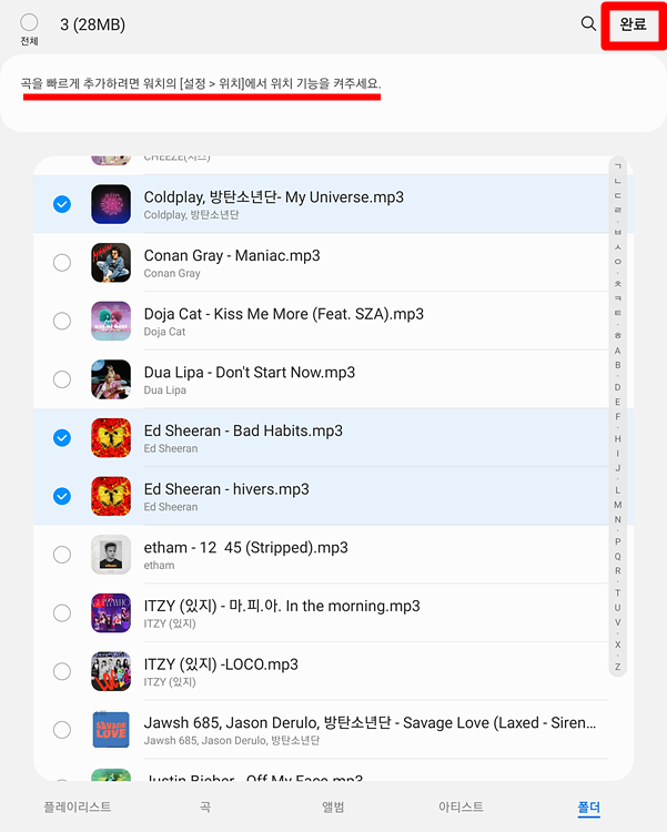 워치4로 옮기고 싶은 음악 파일을 선택하고, 완료를 누르세요.폰으로 조작하는 것은 이것으로 끝입니다.음악파일 삭제하고 싶을 때도 핸드폰으로?스마트 폰에서 워치 4에 있는 음악 파일을 삭제할 수 있습니다.하지만 절대 권하지는 않아요.너무 느려요
