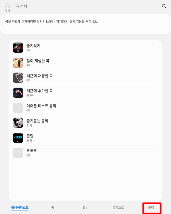 화면 하단을 보면 플레이리스트, 곡, 음반, 아티스트, 폴더 항목으로 구분해 놓았는데 저는 폴더에서 음악을 찾기에 더 좋았습니다.폴더를 클릭하고 추가할 노래가 있는 폴더를 찾아 누릅니다.휴대전화 안의 음악 파일을 표시합니다.