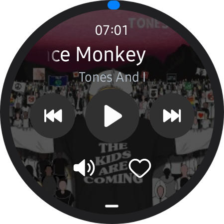 뮤직 플레이어를 켰을 때 표시되는 화면입니다.앨범 재킷을 대기화면으로 보여줍니다.스피커를 누르면 소리 조절이 돼요.