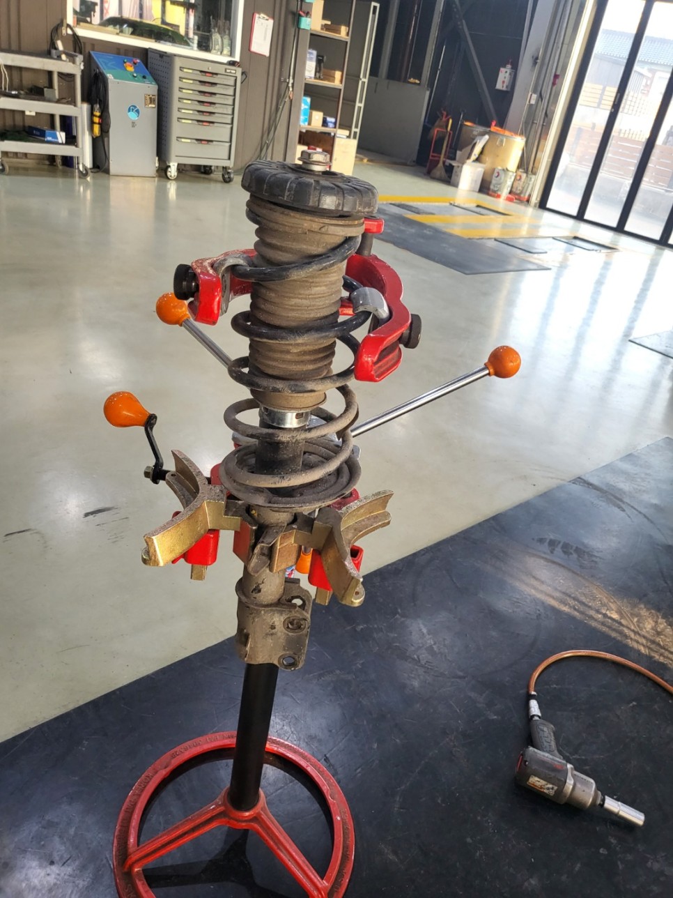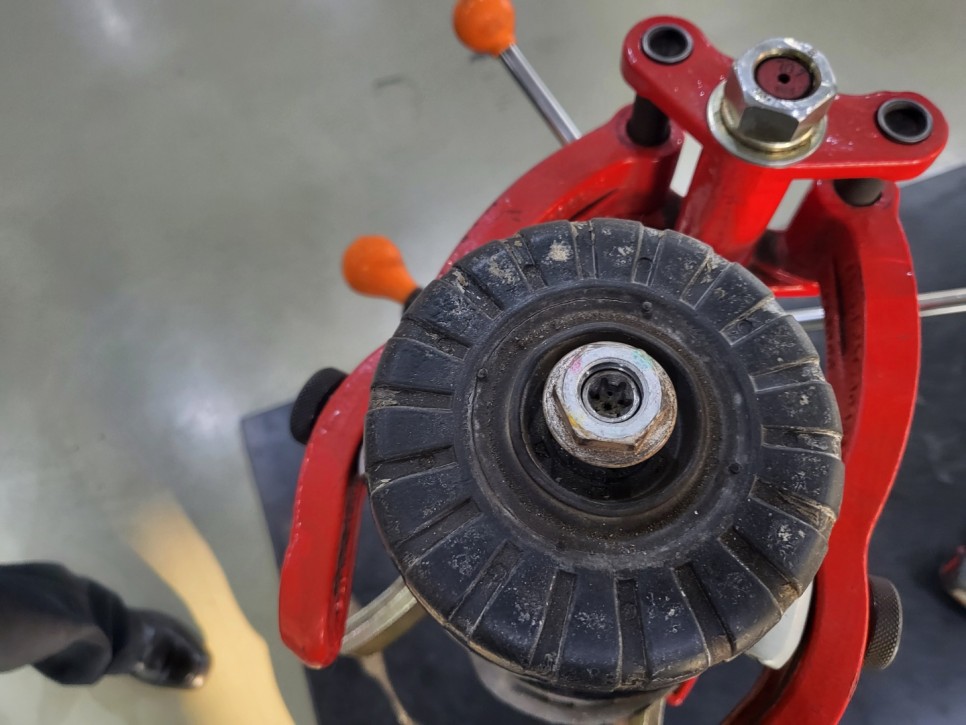 탈구된 쇼버는 스프링 탈착기에 장착하여 스프링을 수축시키고 쇼버 마운트를 탈구합니다.
