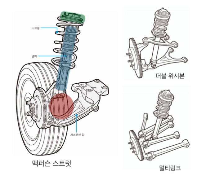 맥퍼슨 스트랫 방식은 바퀴가 연결된 허브(너클 암)를 로우 암과 쇼버와 연결하여 만든 서스펜션 구조로 구조가 간단하고 정비성이 좋으며 제조 단가도 다른 서스펜션 구조에 비해 저렴하여 많은 차량에서 사용되고 있습니다.