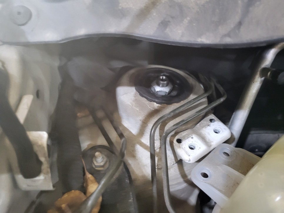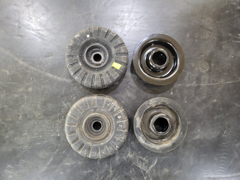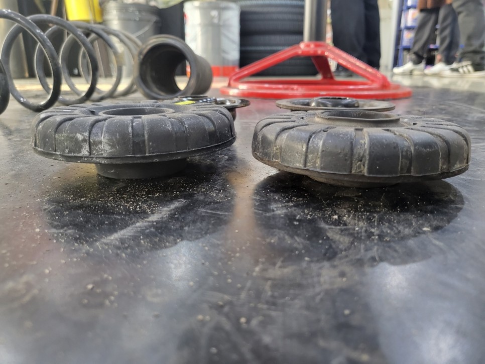 하지만 옆에서 보면 오른쪽에 사용하던 마운트가 차량의 무게에 눌려 납작하게 되어 있는 것을 알 수 있습니다.이와 같이 수축된 양만큼 놀이가 발생하여 소음을 만듭니다.섀시와 마운트 사이에 모래 등의 이물질이 침투하면 소음이 더욱 심해질 수 있습니다.