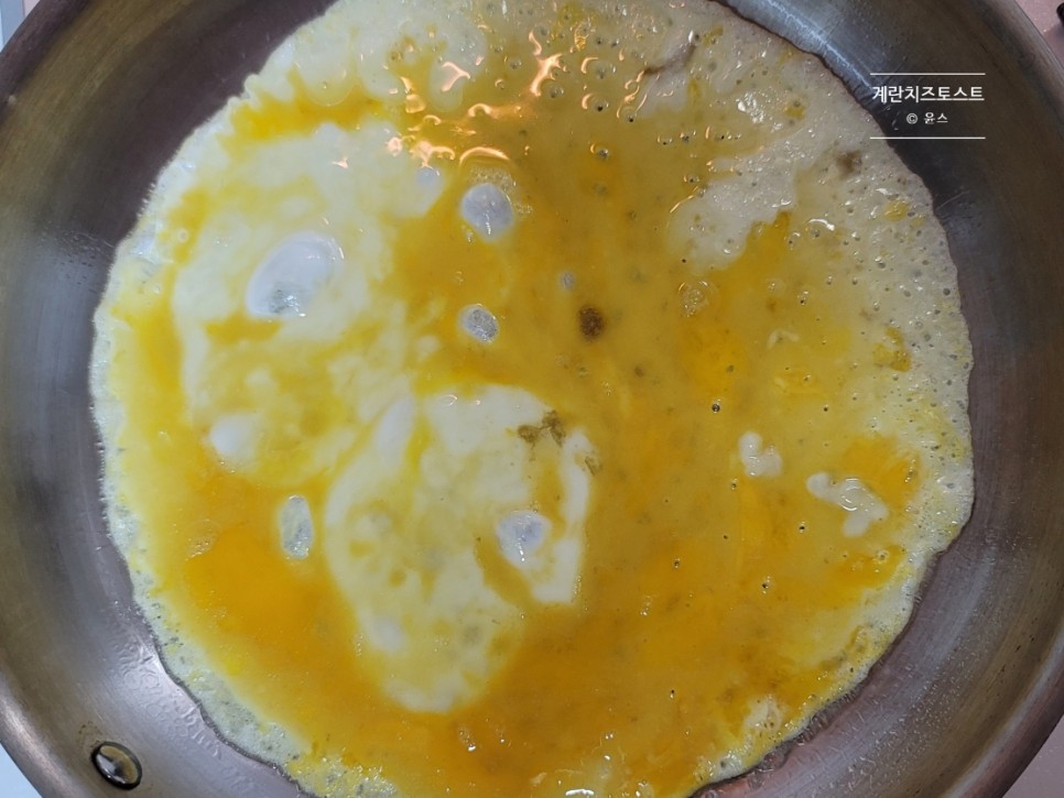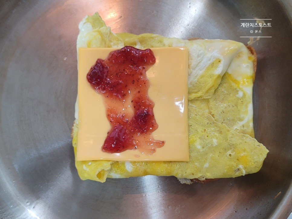 재료(1개분) : 식빵 1장(일반사이즈), 치즈 1장, 달걀 2개, 소금 1/5작은술.+ 딸기잼 조금, 부침개 오일 조금. 버터 조금.