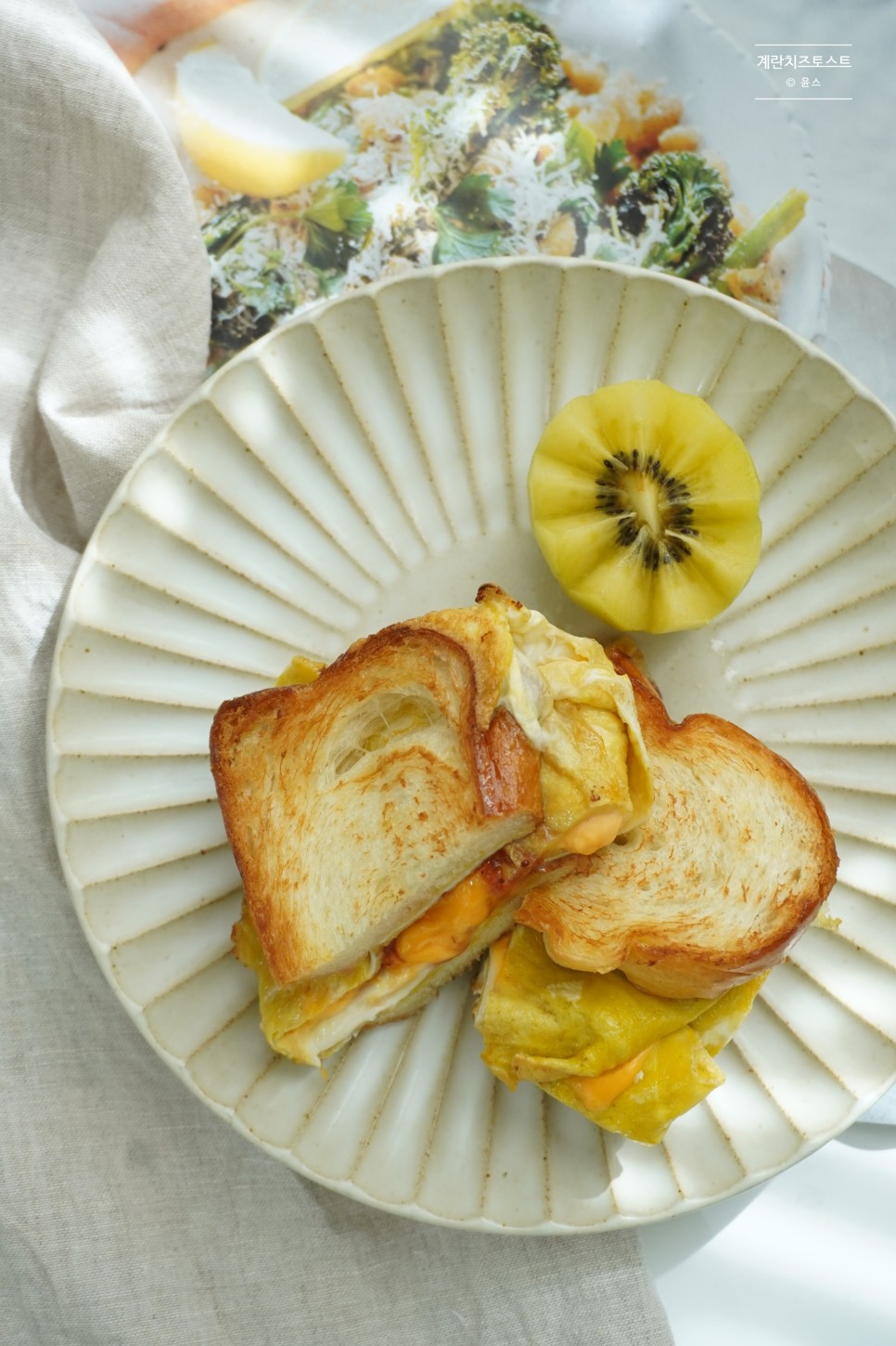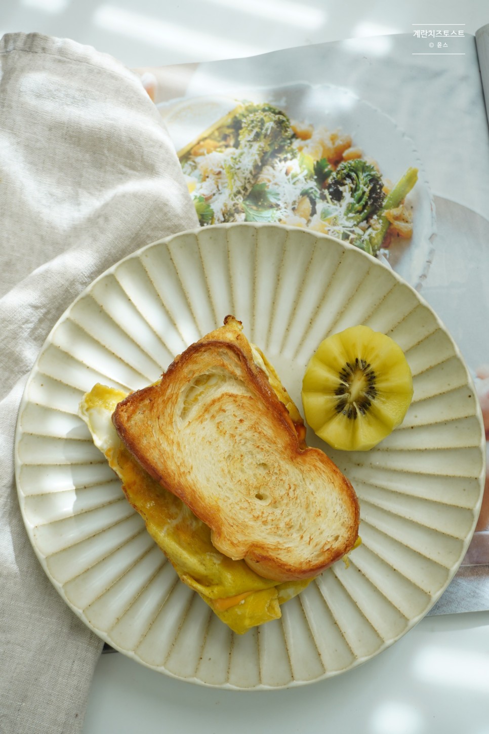 키위 한 조각과 곁들였습니다. 간식으로도 브런치로도 항상 선호되는 치즈토스트입니다.