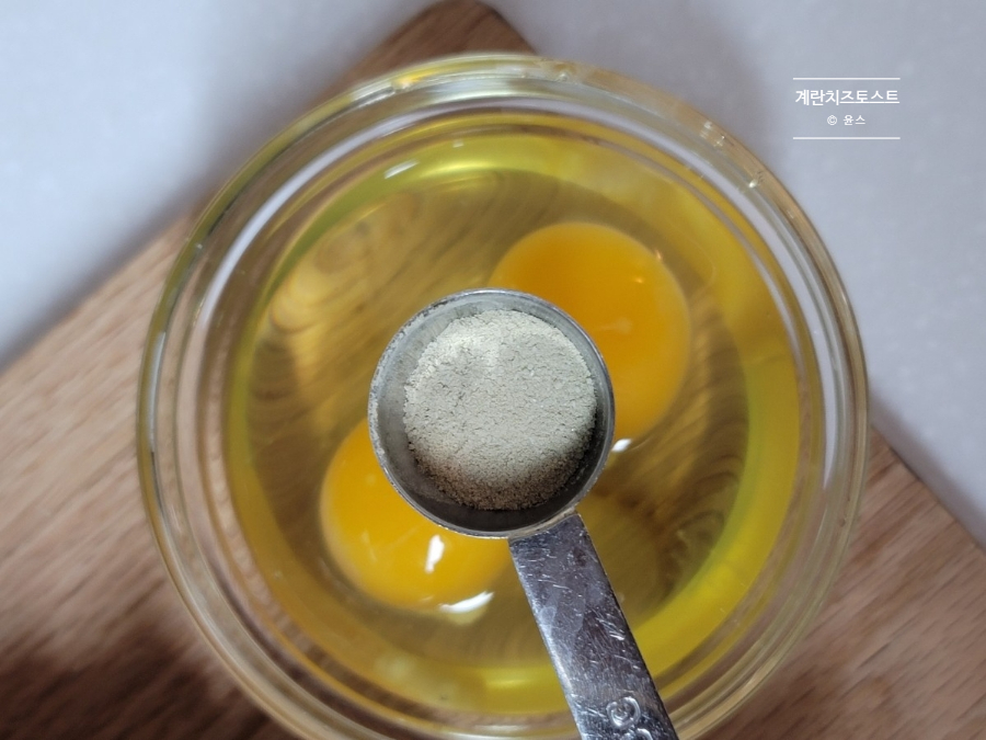 계란 2개에 잔소금 5분의 1 작은 글씨 정도 넣고 저어요
