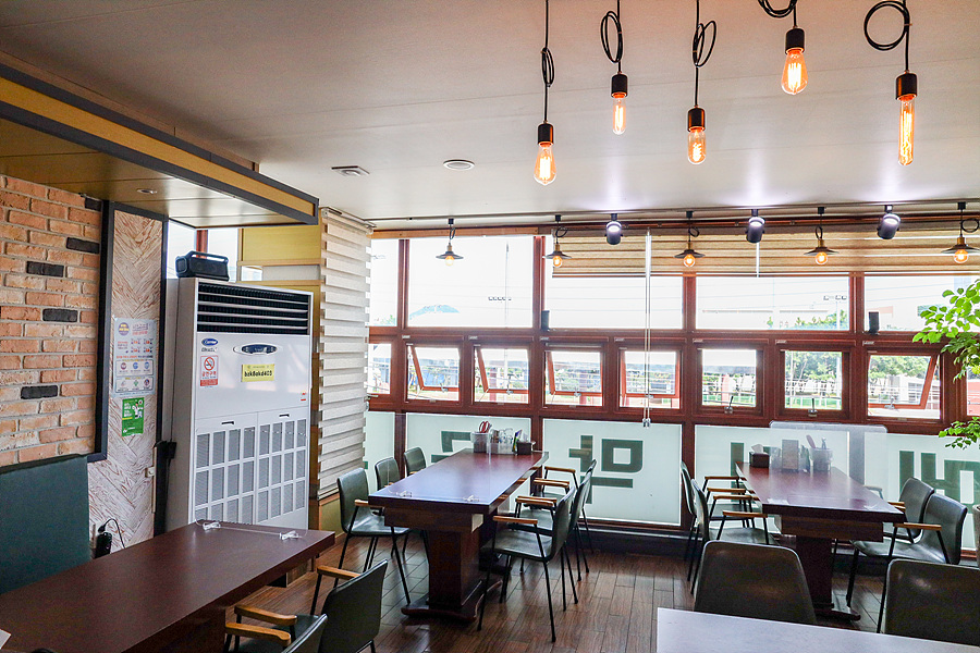홀은 입식으로 통일되어 있어서 단조롭습니다.천장에는 예쁜 전구가 매달려 있어 제주 모슬포 맛집만의 분위기를 풍겼습니다.