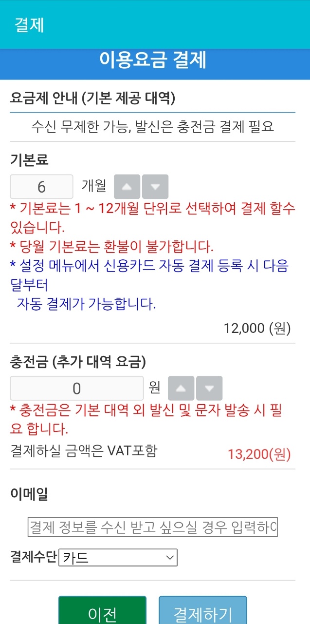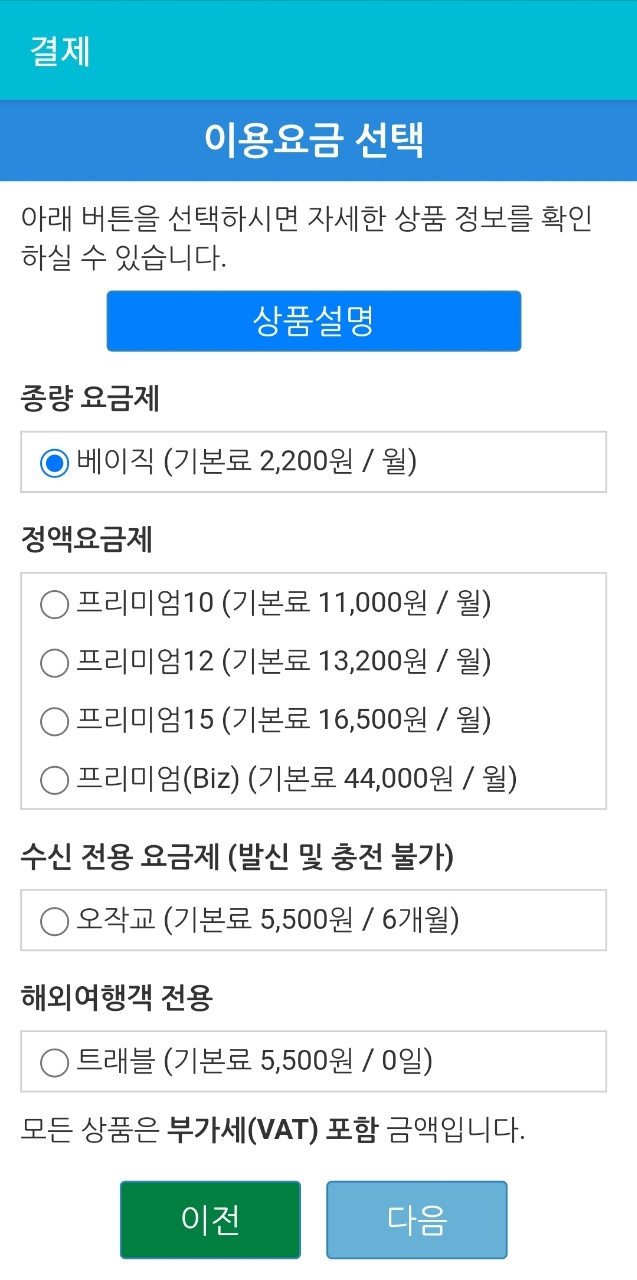 저는 기본 베이직(월 000원) 제품을 6개월 결제 하였습니다.한 달씩 자동결재를 할 수도 있어요.베이직 요금제는 월 2,000원 기본요금으로 수신전화와 수신메일을 받을 수 있으며 충전하면 발신도 가능합니다.