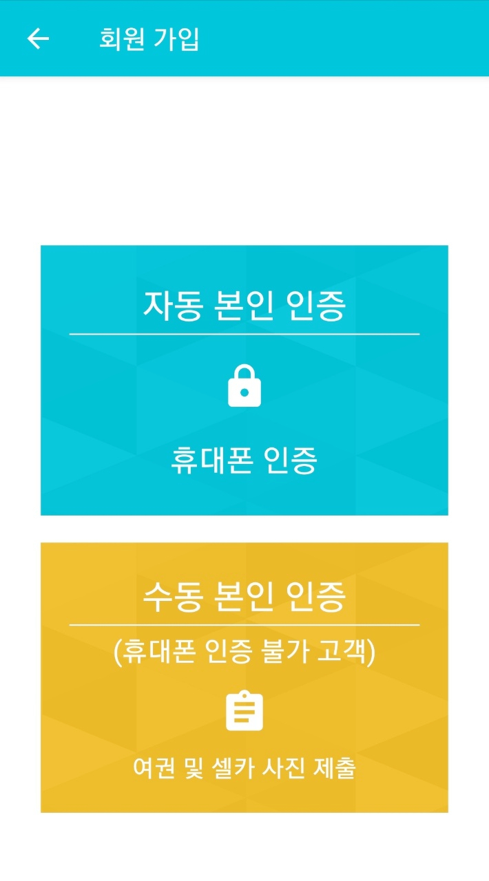 순서대로 진행하겠습니다한국 내 USIM칩이 없으신 분은 수동 본인인증을 클릭해주세요.