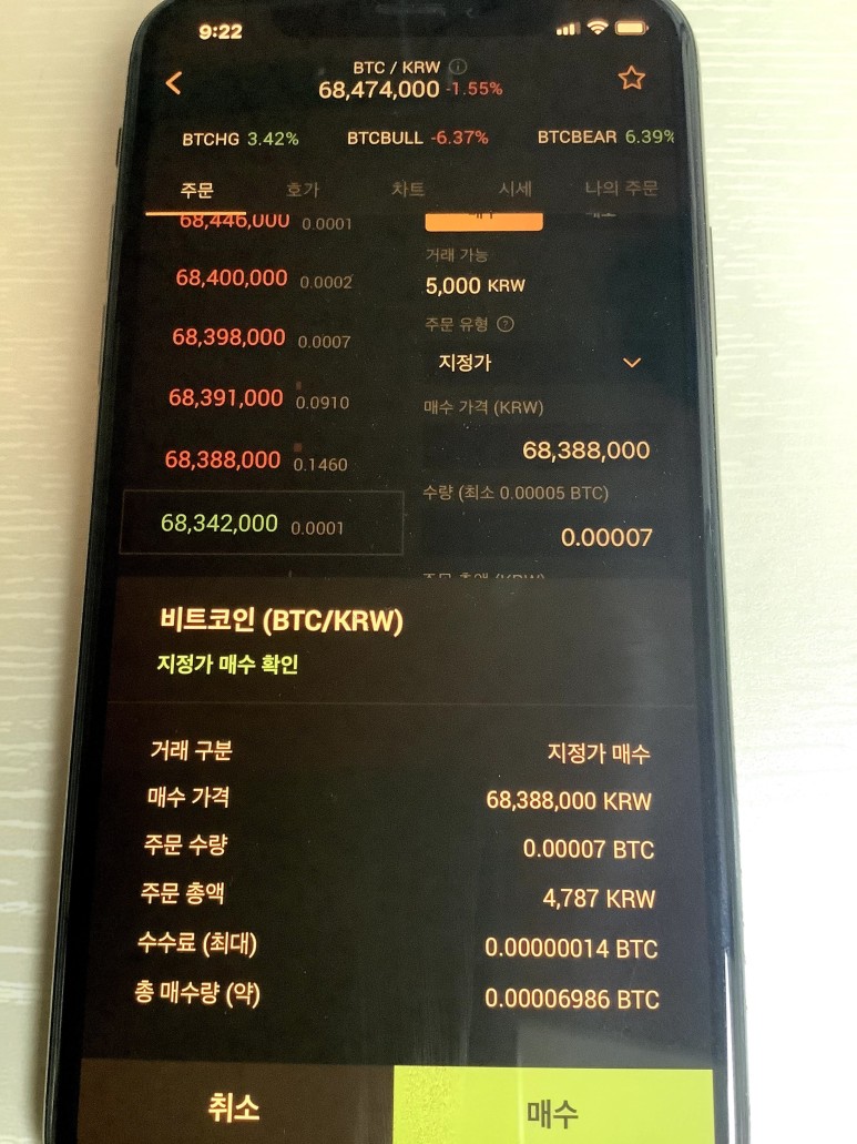 1) 지정가 주문을 선택하고 인수할 가격을 선택한다. 나는 매도호가 중에서 가장 싼 6838만8000원을 골랐다. 2) 그리고 매수할 수량을 입력하면 되는데 최소 수량은 0.00005BTC 이다. 현재 가격으로 5000원로는 0.00007비트코인 매수 주문을 낼 수 있었다.