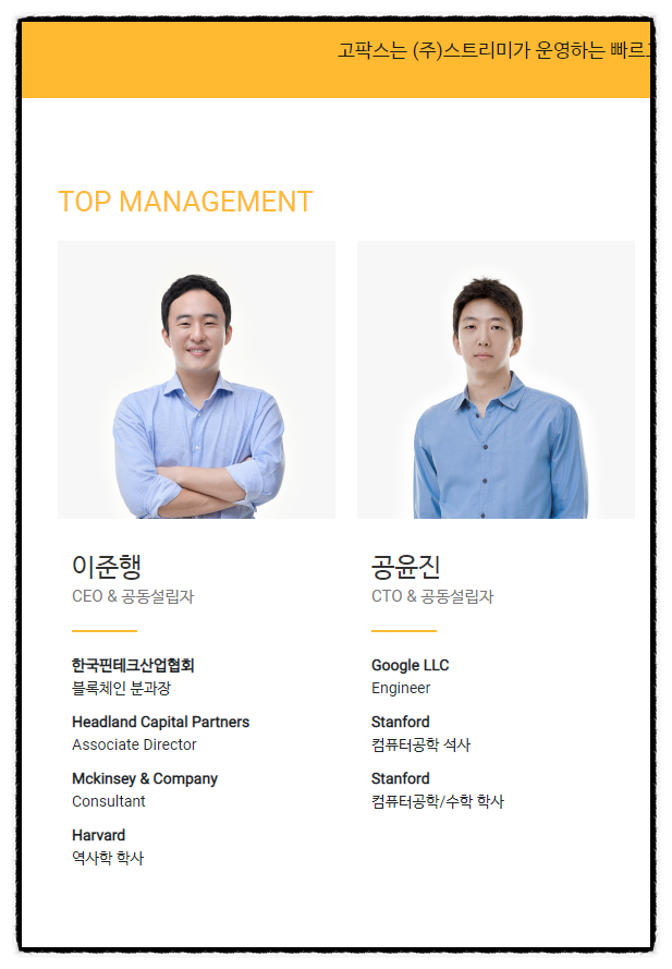 이준행 CEO는 하버드 출신으로 매킨지 근무, 한국핀테크산업협회 블록체인 분과장 경력, 공윤진 CTO는 스탠퍼드 컴퓨터공학 석사 출신으로 구글에서 근무했다.