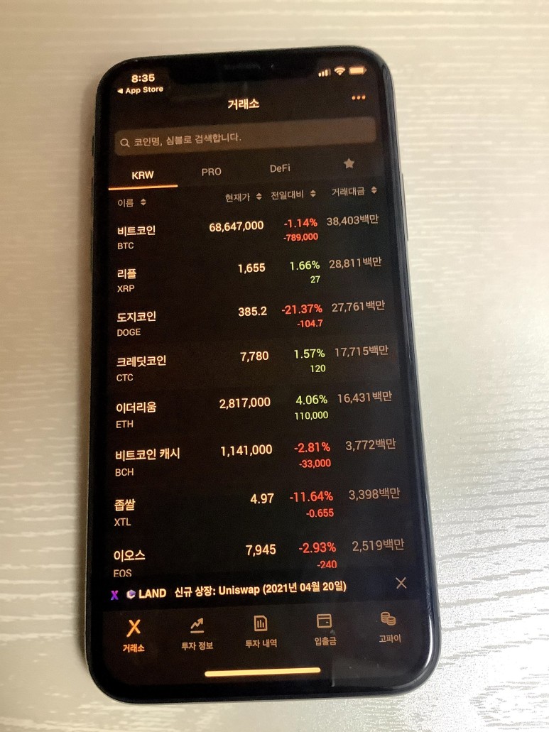Chapter 3 고 팍스에서의 비트코인 시세 확인 방법 = 고 팍스에서의 비트코인 시세 확인 방법은 매우 간단하다. 앱스토어에서 코팍스 앱을 다운받아 실행시키기만 하면 된다. 그러면 비트코인 시세뿐 아니라 다양한 암호화폐의 실시간 시세를 확인할 수 있다. 참고로 2021년 4월 21일 오후 8시 35분 기준 비트코인 시세는 6800만원 정도이다.