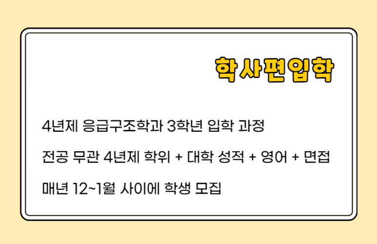응급구조학과 편입은 전공 무관한 4년제 학위와 성적, 영어, 면접이 요구되며,