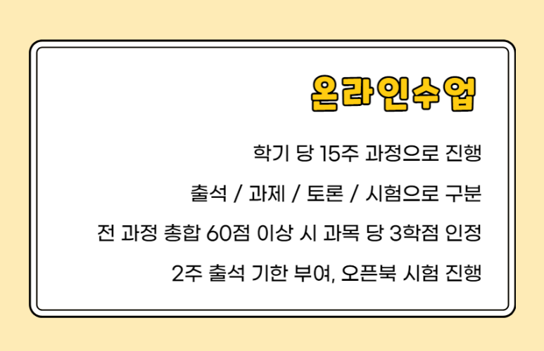 모든 과목이 3학점씩 인정되며 출석은 주차별 강의당 2주 출석기한과 전체 출석률 80% 이상인 두 가지 조건을 충족하면 된다.