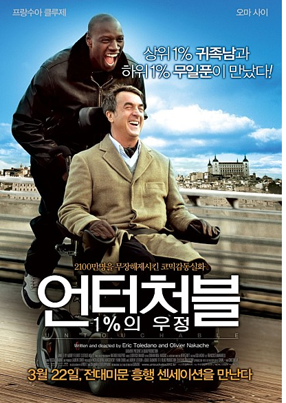 아직 이 영화를 안 봤다면 저는 무조건 추천합니다너무억지로웃기려고해도너무억지로감동을주려고도안하고정말자연스럽게웃겨서저절로눈물이흘리게되는그런영화입니다.처음 언터처블: 1% 우정을 봤을 때 프랑스 영화인 줄 모르고 봤는데 항상 영어 영화를 보다가 프랑스어 영화를 보니까 적응이 안 됐는데 다 보고 나서 이 영화는 프랑스어가 돼야 그 느낌이 제대로 전달되는 것 같아요.