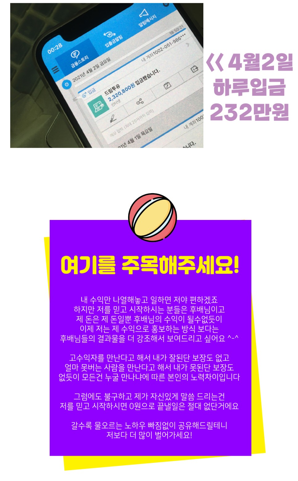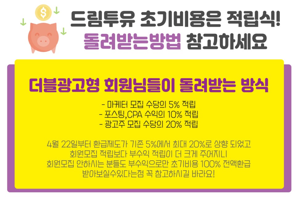난이도만 전혀 없는 자동 수익도 있습니다.자동 실적은 신청만 하면 얻을 모집 수당지만 쉽게 설명하자 누군가 내 글을 보지 않고 그냥 드림·투·유의 광고를 보고가입했을 때의 순서가 오는데 그때의 실적 발생 시 해당 순서 회원의 실적이 됩니다. 환불제도가 바뀌었습니다.최근에는 주수익보다 부수익을 선호하는 신규 멘티가 더 많아져서 본사에서도 이를 알고 환급제도를 4월 22일부로 변경했습니다. 기존 5% 정도 되는 적립식이면 지금은 기존의 최대 20%까지 적립이 되며 모집수당 적립보다 부수이익 적립비율이 더 크기 때문에 부수익만 고집하시는 분들도 부담 없이 제가 낸 돈을 언제든지 돌려 받으실 수 있습니다.
