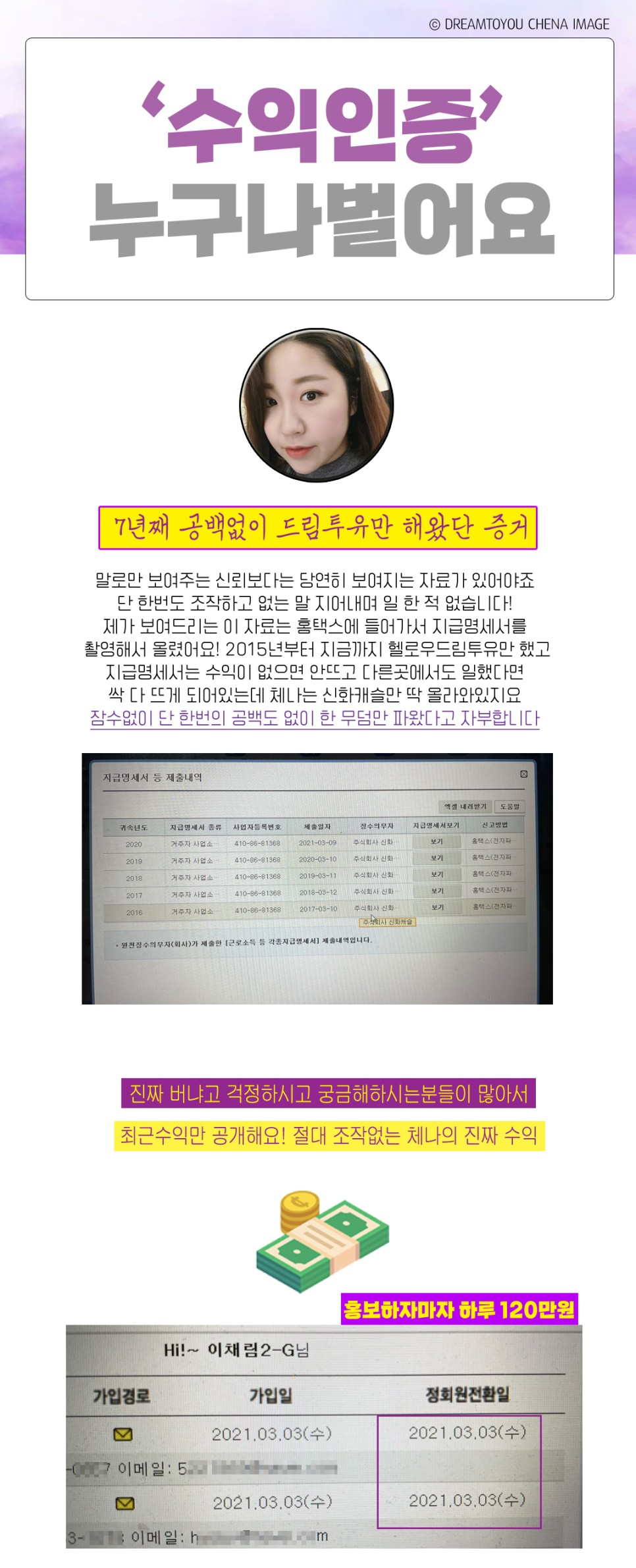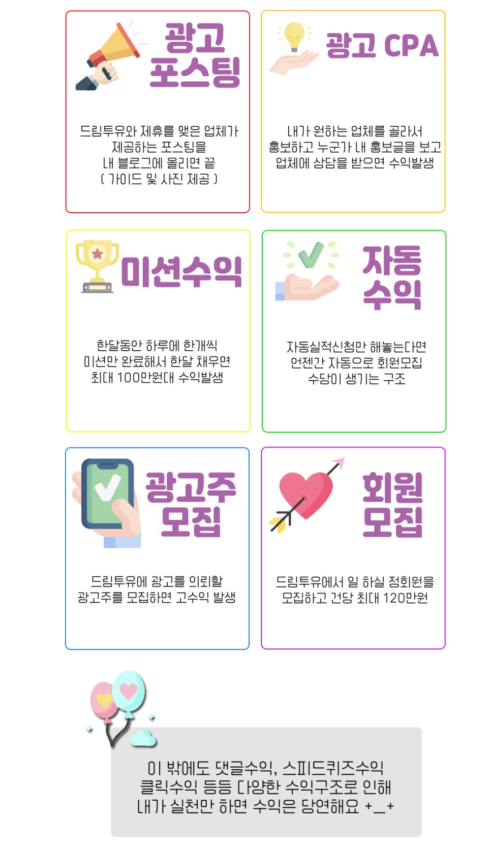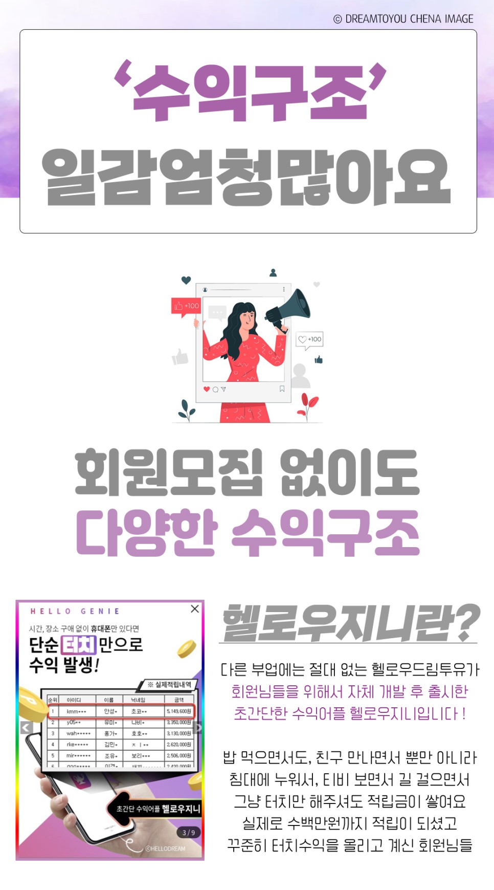 제가 여러분들을 위해서 첨부해놓은 짤들을 보면 2014년부터 나와있을 거예요하지만 본사는 18년간 지속되고 있어요.드림투유의 성장과 정보를 보시면 알겠지만 매년 성장은 물론 여기저기서 수상도 많이 해왔습니다.헬드가 18년이 되었으니까 드림투유는 올해 2년차에 접어들었지만 탄탄한 이야기가 되어주는 본사가 있어서 성장을 빨리 또한 자체 개발하여 앱으로 출시한 헬로지니가 있습니다.이 수익을 말하자면 휴대 전화를 터치하기만 해도 발생하는 수익 구조입니다.