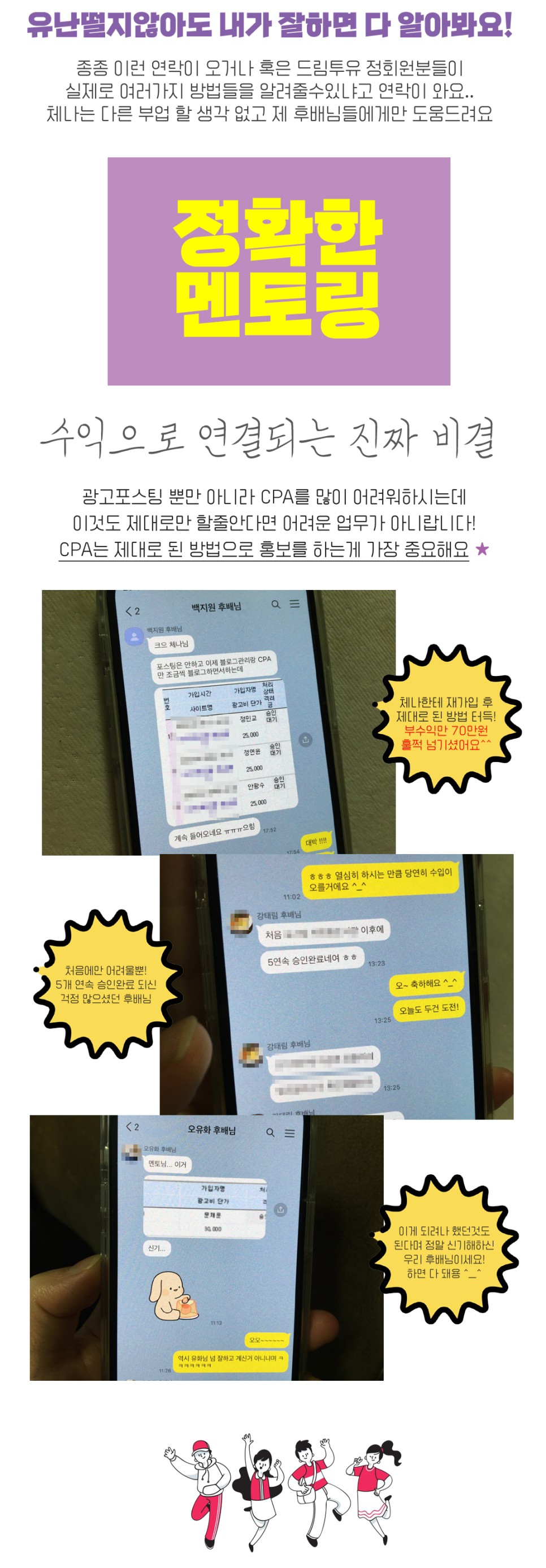 정말 중요한 여기서 제가 하게 될 업무의 난이도는 어느 정도인지를 설명해 드리겠습니다처음에는 어려운게 사실이에요.처음부터 10분 안에 다 해버린다면 이 세상에는 초심자라는 단어조차 없는 것 같고 저도 초심자 시절을 오랫동안 겪어왔기 때문에 확실하게 말하기는 처음에는 어렵습니다.적응이 안 되잖아요. 온라인 마케팅은 다들 해보셨나요?그런데 가이드와 모든 자료가 제공되기 때문에 우리가 그 가이드와 자료를 활용하기만 하면은 쉬울 것 같습니다. 광고 포스팅과 cpa의 차이점, 제가 말씀드리는 이 두 업무는 가장 유명한 부수익 중 두 가지입니다.광포는 제 블로그에 가이드와 자료를 다운받아 그대로 올리는 업무이기 때문에 정말 초보 분들도 바로 첫날부터 들어가는 간단한 난이도를 가진 업무라고 생각하시면 됩니다.저도 틈만 나면 하고 있는 업무로, 3마농부터 바로 주급으로 받을 수 있습니다.주급은 부업무뿐만 아니라 주업무까지 주급으로 받을 수 있도록 바뀌었습니다. 그 다음 cpa는 블로그뿐만 아니라 카페, 지식인 등 다양한 커뮤니티를 활용해서 선택한 업체를 홍보하는 업무인데, 여기서 끝이 아니라 누군가가 자기가 홍보해 놓은 글을 보고 상담 신청을 해야 수익이 떨어지는 업무입니다.